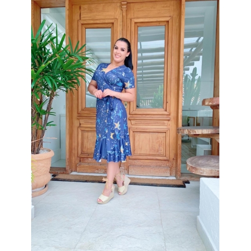 8525 - VESTIDO DE POLIAMIDA TRANSPASSADO AZUL ESTAMPADO DE ESTRELA -SEM TROCA