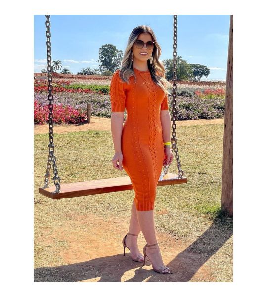 Vestido Tricot Modal Laranja Manga Princesa Detalhe Trança